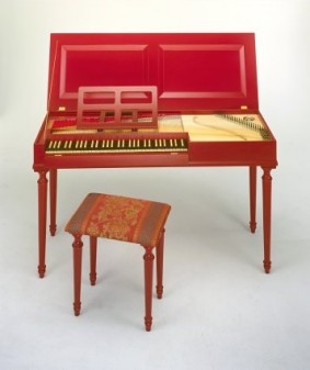EL CLAVECÍN, CLAVICÉMBALO O CLAVE Otra manera de producir sonidos por medio de un teclado es la utilizada por el clave. Su principio de funcionamiento es semejante al de las antiguas cítaras en las que el sonido se obtenía a partir de la vibración de una serie de cuerdas punteadas o pulsadas con los dedos o con plectros o púas. La limitación de un instrumento de este tipo para hacer sonar varias cuerdas a la vez es evidente. El clave, brinda esta posibilidad, cada tecla, al ser presionada, empuja hacia arriba una tablilla que lleva un plectro en su extremo; este pulsa la cuerda de la misma manera en que lo hace un guitarrista con su púa. Este instrumento fue utilizado desde el siglo XIV aunque fue en el XVII cuando cobró mayor importancia. Cayó en desuso a finales del XVIII con la aparición de otro instrumento de teclado: el pianoforte. Semejantes al clave en su funcionamiento son la espineta y el virginal, instrumentos de cuerdas más cortas y con caja de resonancia más pequeña.